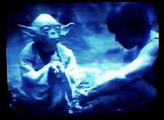 Once Luke has found YODA, the emperor (Satan - Lucifer) says that he has a new enemy who could destroy his evil empire and put the world right and bring peace, Love and harmony, to everyone. (Like Muad'Dib does in the film "Dune" - please see my "Dune-Gibraltar" Booklet).Luke practises standing on his head with YODA and R2D2 standing on his upturned feet, which symbolises that he is training himself to use the "Force" so well that he can do it "standing on his head". YODA and R2D2, being supported by Luke's feet symbolises that when he loses his "blind-faith" and thereby the "Force's" help, he lets down not only himself but those who are depending upon him to succeed.